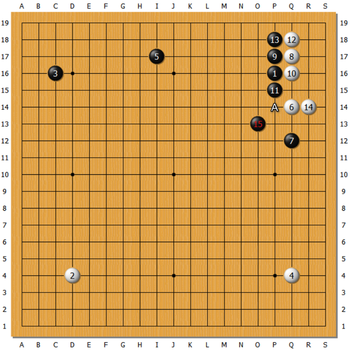 白12通常在14位先立,因为这一招有变,复盘者认为“白14者从A位冲,也许是好机会”。