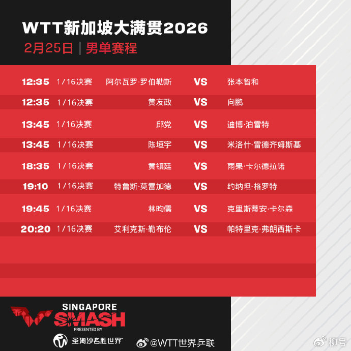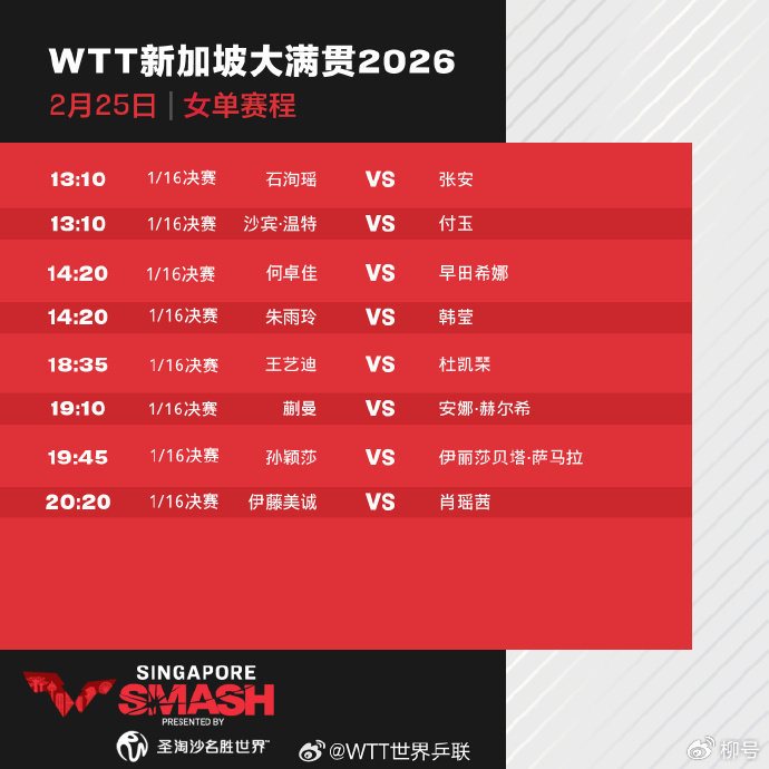 北京时间2月25日消息,2026年WTT新加坡大满贯继续进行,CCTV5、CCTV5+直播比赛实况。女子单打1/16决赛第二个比赛日,世界第一孙颖莎、王艺迪、何卓佳等5名中国女将出战。其中,何卓佳迎战日本一姐早田希娜(13:10),孙颖莎迎战罗马尼亚选手伊丽莎贝塔·萨马拉(19:45)。