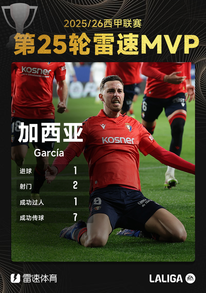 雷速西甲评选:奥萨苏纳前锋加西亚绝杀皇马,当选第25轮MVP