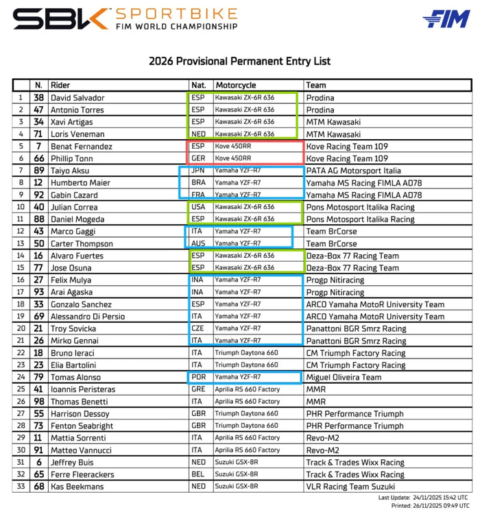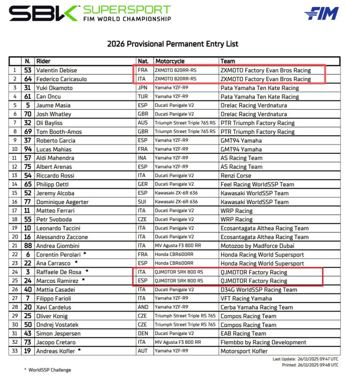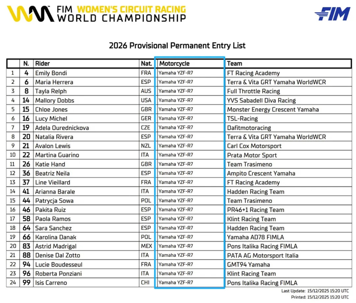2026年WCR组别的参赛名单已经确认,一共有24名参赛车手,参赛车型为统一的雅马哈R7。WSBK女子组的比赛成了雅马哈R7的“统规赛”,好家伙雅马哈成了女子组最大的赢家。