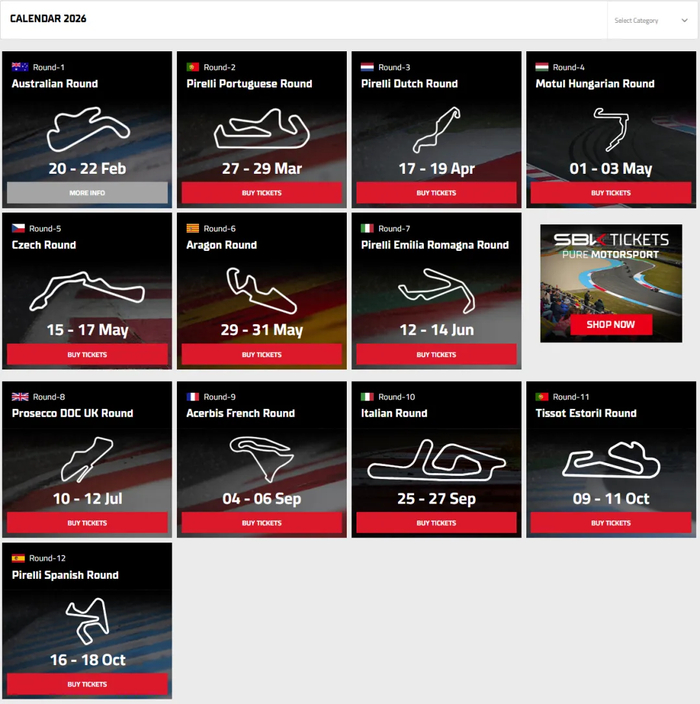 SBK(Superbike)公升级组别,也就是WSBK比赛当中最高级别的赛事。很好理解这个组别的参赛车辆,均为公升级别的仿赛车型,且参赛车辆均为量产赛车。与标准公路车型相比,世界超级摩托车锦标赛赛车,允许进行一些改装,例如:发动机管理系统、排气系统、悬挂系统、刹车系统以及部分发动机部件。自2015年引入技术改装限制以来,赛车改装如今受到的限制比往年更多。这使得SBK组别成为各大摩托车制造商,展示其高性能量产车型技术与性能的顶级舞台,截止到2026赛季,SBK组别还没有国产品牌参与其中。