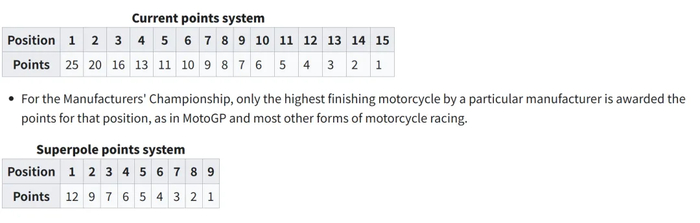 WSBK两回合正赛获得前15名的车手,依次按照25-20-16-13-11-10-9-8-7-6-5-4-3-2-1的方式得分;WSBK超级杆位赛前8名依次获得12-9-7-5-4-3-2-1个积分。而周六的杆位赛没有积分,第一场正赛、周日的超级杆位赛以及第二场正赛都会有积分。积分是决定车手、车队和制造商年度总冠军的唯一依据。车手在每站比赛中通过正赛和超级杆位赛获得积分,赛季结束后总积分最高的车手将加冕为WSBK世界冠军。
