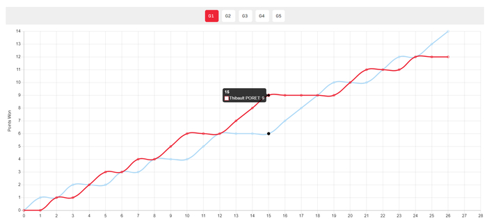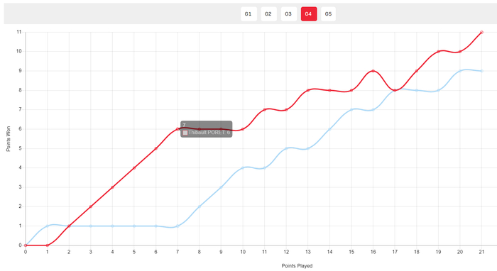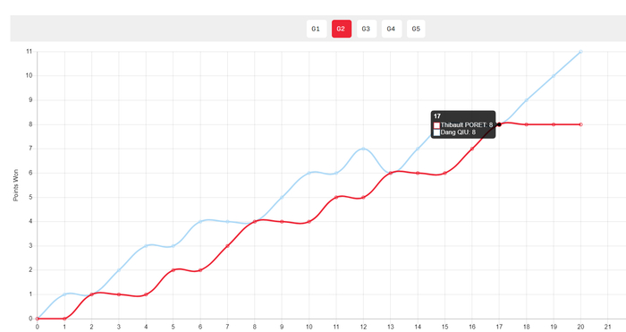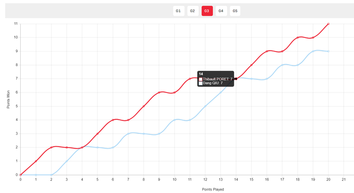 第一局开场两人1-1、2-2、3-3、4-4,随后泊雷特一度8-5领先,但邱党连拿三分扳平大比分,随后泊雷特11-10局点,邱党14-12扭转成功。