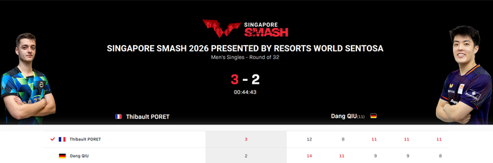 北京时间2月25日,WTT新加坡大满贯男单1/16决赛,泊雷特3-2邱党晋级,五局比分:【12-14,8-11,11-9,11-9,11-8】。这场比赛法乒21岁的超星泊雷特在大比分0-2落后的情况下连赢三局,泊雷特完成了一场超级逆转。