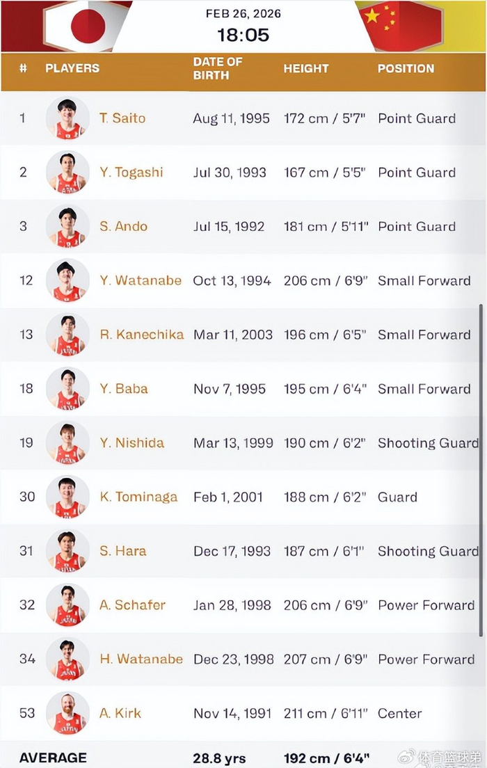 而后,日本男篮12人名单也诞生,包括了阿莱克斯-柯克、安藤誓哉、富坚勇树、原修太、渡边雄太、齐藤拓実、马场雄大、幸树、渡边飞勇、西田优大、富永启生、金近廉,此前归化的内线核心霍金森并不在上面,取代的是另一位归化球员阿莱克斯-柯克。