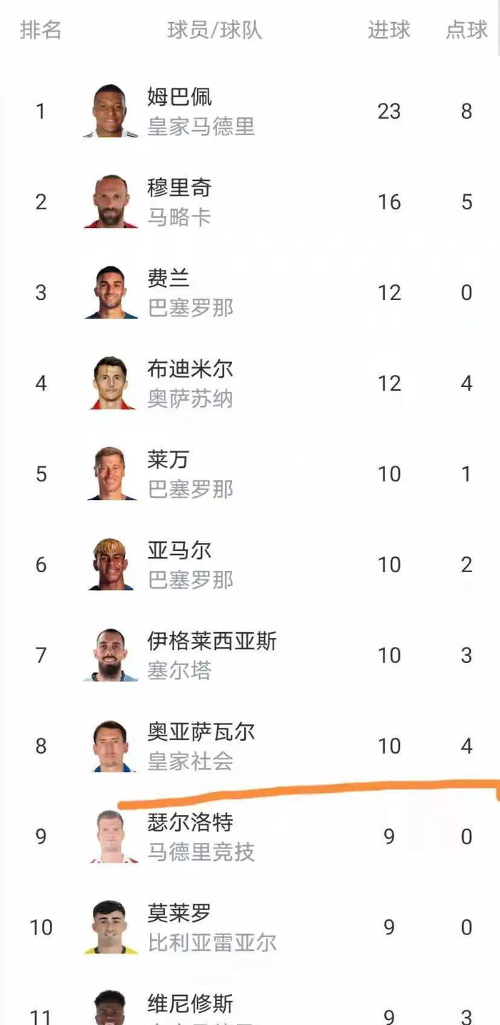 与此同时,西甲射手榜的竞争也在同步进行。 巴黎圣日耳曼的巨星姆巴佩,如今以23个进球在西甲射手榜上一骑绝尘,展现出了超一流的得分效率。 紧随其后的是打入16球的穆里奇。 再往后,费兰·托雷斯、布迪米尔同以12球并列,而莱万多夫斯基、亚马尔、伊格莱西亚斯、奥亚萨瓦尔等名将也都突破了10球大关,形成了一个竞争激烈的第二集团。