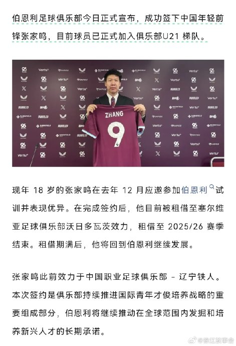 18岁的中国前锋张家鸣正式加盟英超伯恩利俱乐部U21梯队,但由于劳工证问题,他已被立即租借至塞尔维亚沃日多瓦茨俱乐部锻炼,计划于2025/26赛季结束后回归伯恩利发展。
