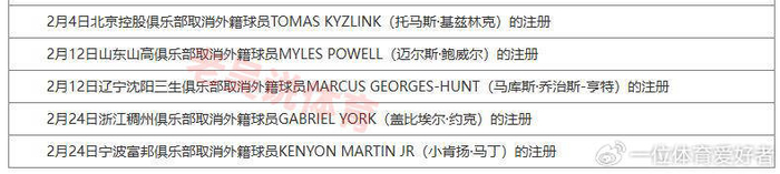 第二个消息,CBA官方网站显示,浙江稠州男篮取消盖比埃尔·约克的注册,宁波富邦町渥男篮取消小肯扬·马丁的注册。