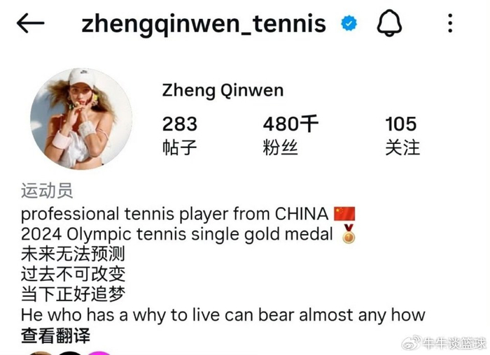此外,郑钦文还更换了新头像,并将个人社媒简介更新为尼采的名言:“He who has a why to live can bear almost any how”(有活下去理由的人可以忍受任何方式)。