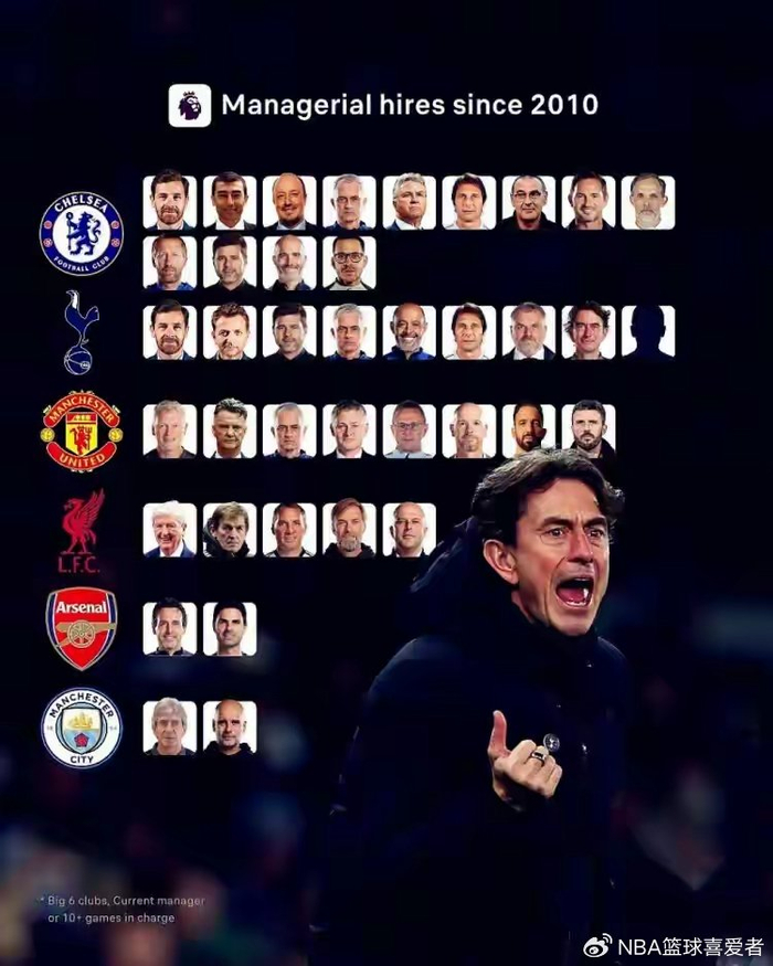 说到主帅稳定性,英超BIG6的数据对比简直是一部豪门兴衰史。切尔西13年换13位主帅,从博阿斯到马雷斯卡,这换帅频率比有些球队换球衣还勤快。热刺9人、曼联8人,相比之下利物浦的5人已经算克制了。但真正恐怖的是曼城和阿森纳——都只有2任正式主帅。您品,您细品,这数字背后是什么?是建队思路的连贯性,是更衣室的稳定,是战术体系的持续深化。
