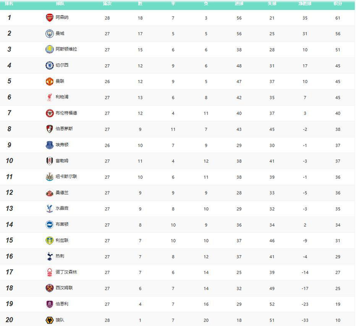 5、英超:阿森纳5分领跑,曼城紧随其后仍有悬念