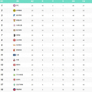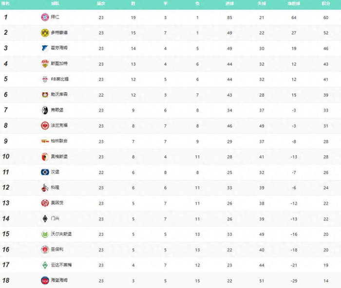 德甲23轮战罢,目前还剩11轮,拜仁3-2惊险战胜法兰克福,而多特蒙德2-2绝平RB莱比锡,这样拜仁积分来到60分继续领跑德甲,领先第二位的多特蒙德8分。