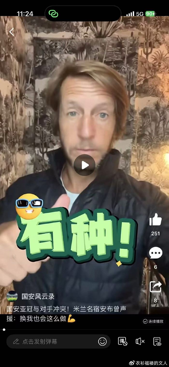 不过,对于国安在这场比赛中与对手发生冲突这件事,米兰名宿安布在赛后曾经专门拍摄视频声援国安,在视频中先是表示国安球员有种!同时,他还表示看到现场的视频,实话实说自己也会做出同样的举动,国安球员的目的是保护自己的队友,在收到对方球员的挑衅之后,在自己队友陷入危险之中,前来帮助队友,换作自己也会这么做,自己也永远会选择这条路,为队友出头是正确的,当然裁判可能会给出处罚,但是在场上没有人,可以触碰自己的队友,所以自己还是支持国安球员冲上去保护自己的队友,即便是因此吃到了处罚,也一定要团结起来。