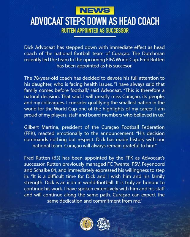 库拉索出线后,艾德沃卡特曾表示自己当时爱妻心切,匆匆离开库拉索队有些过于着急。当他回到家中时,才获悉妻子的病情并不算严重。而因为主教练无法现场指挥,库拉索险些无缘出线,艾德沃卡特也差点错过时隔20年再次带队征战世界杯的机会。但这次,艾德沃卡特的辞职决定经过了深思熟虑。未来数月他将全身心照顾罹患重病的女儿,无力兼顾教练职务,只能选择放弃。库拉索队医范艾克也一并离职,为艾德沃卡特陪伴女儿提供必要的医疗帮助。