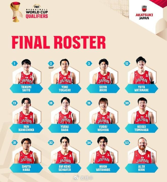 作为对手,日本男篮也是公布了他们的12人名单,最值得关注的就是他们的归化中锋使用了年纪更大、实力更弱的柯克,没有用更年轻也更厉害的霍金森。