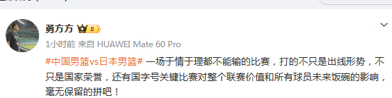 赛前,北京记者勇方方发文点评:“中国男篮vs日本男篮,一场于情于理都不能输的比赛,打的不只是出线形势,不只是国家荣誉,还有国字号关键比赛对整个联赛价值和所有球员未来饭碗的影响,毫无保留的拼吧! ”