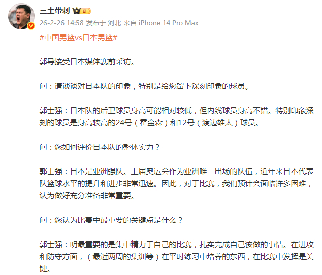 媒体人三土带刺在社媒附上了中国男篮主教练郭士强接受日本媒体赛前采访的原文。郭士强表示,日本男篮的球员中他对渡边雄太和归化球员霍金森印象最深刻。同时,郭士强称日本男篮是亚洲强队,中国男篮预计会面临诸多困难。