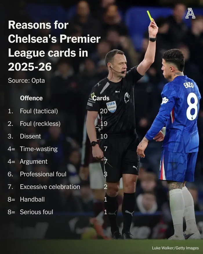 切尔西本赛季英超吃牌原因排行:战术犯规20张,表达异议10张