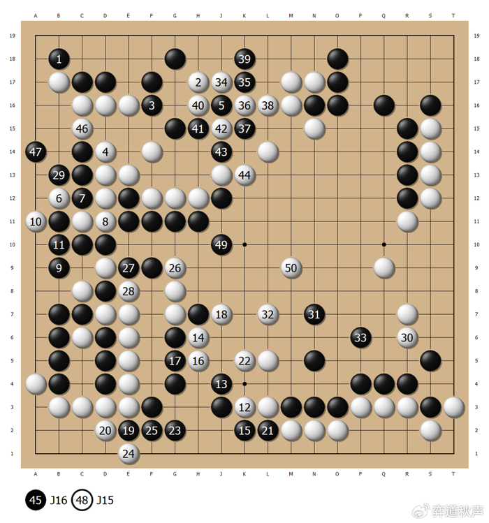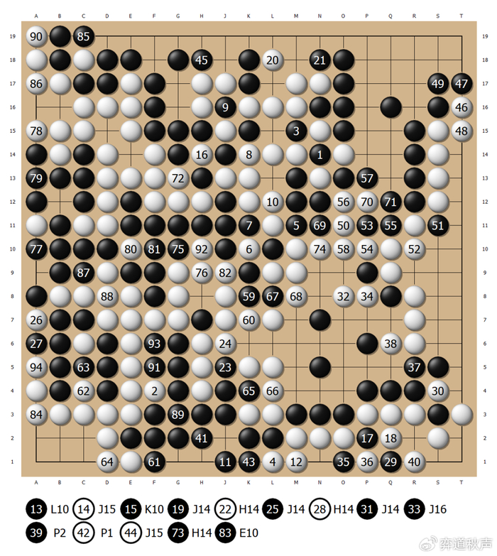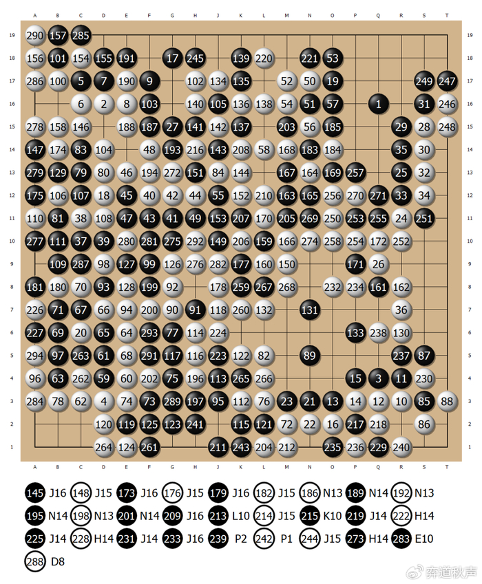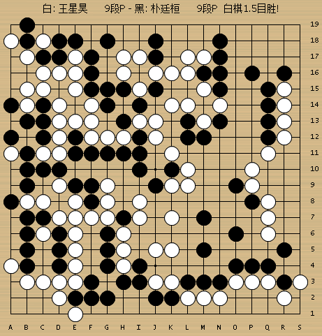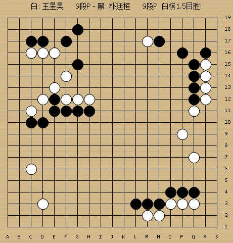 最后变成上方白棋和右下黑棋的大转换,好在盘点目数,星昊仍有微弱优势!
