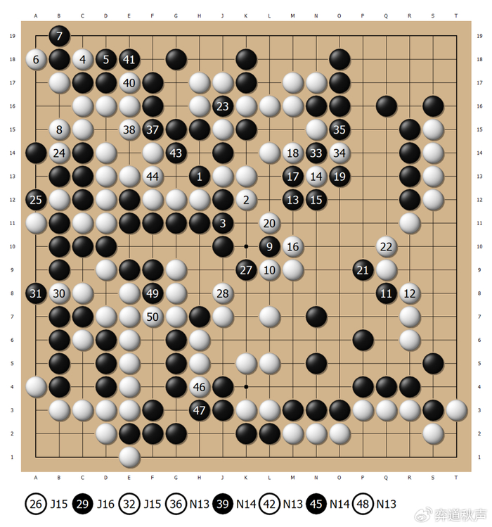 到黑25活棋,白26补,仍是非常胶着的局势。