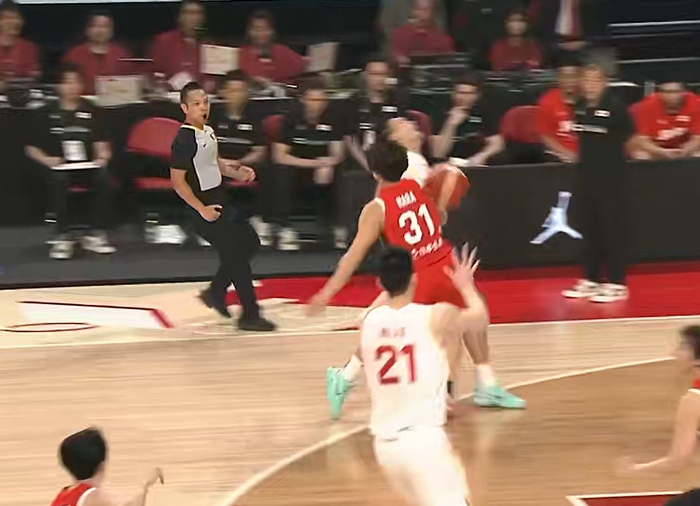 #中国男篮vs日本男篮# 这球不给违体说不过去,球都传到篮下了。