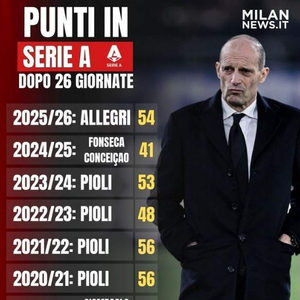 本赛季AC米兰在前26轮意甲过后积分54分,比上赛季同期提升明显。近几个赛季AC米兰在26轮后同期积分情况如下:25/26赛季阿莱格里执教54分;24/25赛季丰塞卡执教41分;23/24赛季皮奥利执教53分;22/23赛季皮奥利执教48分;21/22赛季皮奥利执教56分;20/21赛季皮奥利执教56分;19/20赛季詹保罗、皮奥利执教36分;18/19赛季加图索执教48分。本赛季54分仅次于21/22和20/21赛季的56分,反映出球队的进步。