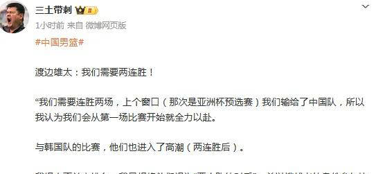 在世预赛第二个窗口期即将拉开帷幕之际,日本男篮将于2月26日主场迎战中国男篮。赛前,日本队核心球员渡边雄太接受媒体采访,直言自己对排名毫不关心,而是全身心把中国队视为必须击败的对手。渡边表示:“我们这次需要连赢两场比赛。在上个窗口期,我们输给了中国队,所以从比赛第一分钟起,我们就会全力以赴,争取拿下胜利。”他强调,“我把中国队看成一个强劲的挑战者,以必胜的态度去面对这场较量。”