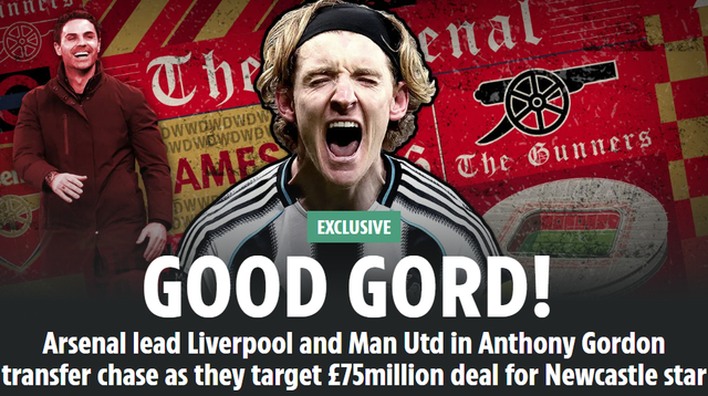 戈登出道于埃弗顿青训,2023年1月从埃弗顿加盟纽卡,转会费4000万英镑。《太阳报》指出,阿森纳主帅阿尔特塔,一直都很欣赏戈登。早在戈登效力埃弗顿期间,阿尔特塔就注意到他的才华和潜力。阿森纳希望在左边锋位置引援,戈登是最佳选择。同时,戈登还能客串中锋,能为球队的进攻提供更多的选择和变化。