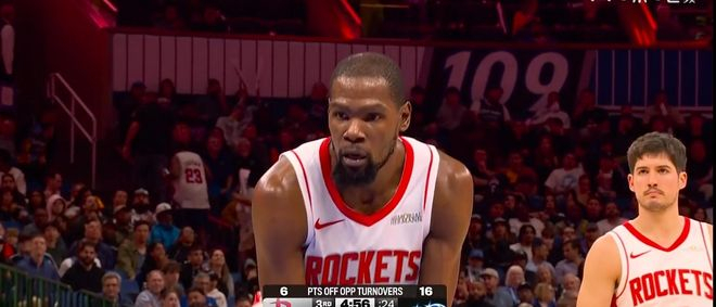 到了第二节,火箭的手感还是没回温,外线三分七次出手只命中一个,除了杜兰特,其他球员几乎都没什么发挥,站在场上找不到节奏。杜兰特今天是真的稳得离谱,哪怕队友都不开,他自己里突外投单节砍下10分,硬是把分差给咬住,没让魔术一下子把比分彻底拉开。魔术这边命中率比首节稍微降了一点,但是单节还是赢了火箭两分,半场打完,魔术53比43领先,分差来到整整10分。