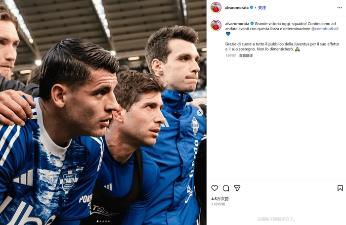 虎扑02月22日讯 意甲联赛,科莫2-0战胜尤文图斯。赛后,莫拉塔更新了Instagram: