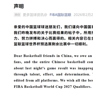 亲爱的中国篮球球迷朋友们,我们谨向中国国家队、中国球迷以及整个中国篮球界致歉。我们昨晚发布的关于比赛结果的帖子中,所用措辞是不妥的。中国队的胜利是通过自身实力、努力拼搏和决心而赢得的。相关内容已在全平台删除或修正。祝愿中国队在2027国际篮联篮球世界杯预选赛剩余比赛中一切顺利。