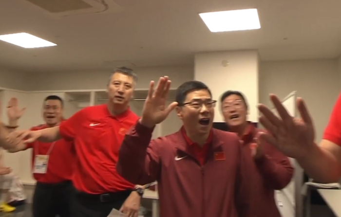 在中国男篮客场逆转日本队后,郭振明早早在更衣室等待球员们回来。当球员们一个个走回更衣室,郭振明持续激情呐喊,和大家伙一起享受喜悦。