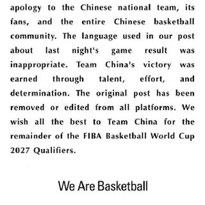 争议文案迅速点燃全球篮球圈怒火。海外社媒评论区涌现大量理性驳斥:"中国队当之无愧的胜利何来'偷窃'?"、"该反思的是偏哨裁判"。中国球迷更以英语据理力争,直指措辞的偏见本质。面对汹涌舆情,国际篮联虽连夜将文案修正为客观描述"中国男篮下半场翻盘获胜",但未致歉的态度引发二次质疑。直至27日,压力之下的FIBA终于发布中英双语声明,向"中国国家队、球迷及整个篮球界"正式道歉,明确承认措辞不当,并强调胜利是"通过自身实力、努力拼搏和决心赢得"。所有平台争议内容均被删除或修正。