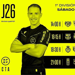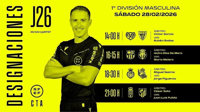 西班牙足协官方公布了周六西甲比赛的裁判安排,迪亚斯-德梅拉将执法巴萨vs比利亚雷亚尔。