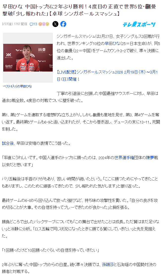 赛后日本媒体《东京乒乓球新闻》发文:早田希娜时隔两年再次战胜中国世界排名前五的选手,她在决胜局大比分落后的情况下逆转世界第五蒯曼,努力终于有了回报。
