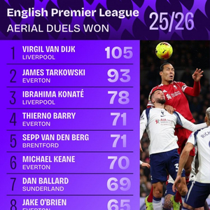 范戴克本赛季争顶成功105次英超最多,成功率77.2%英超最高