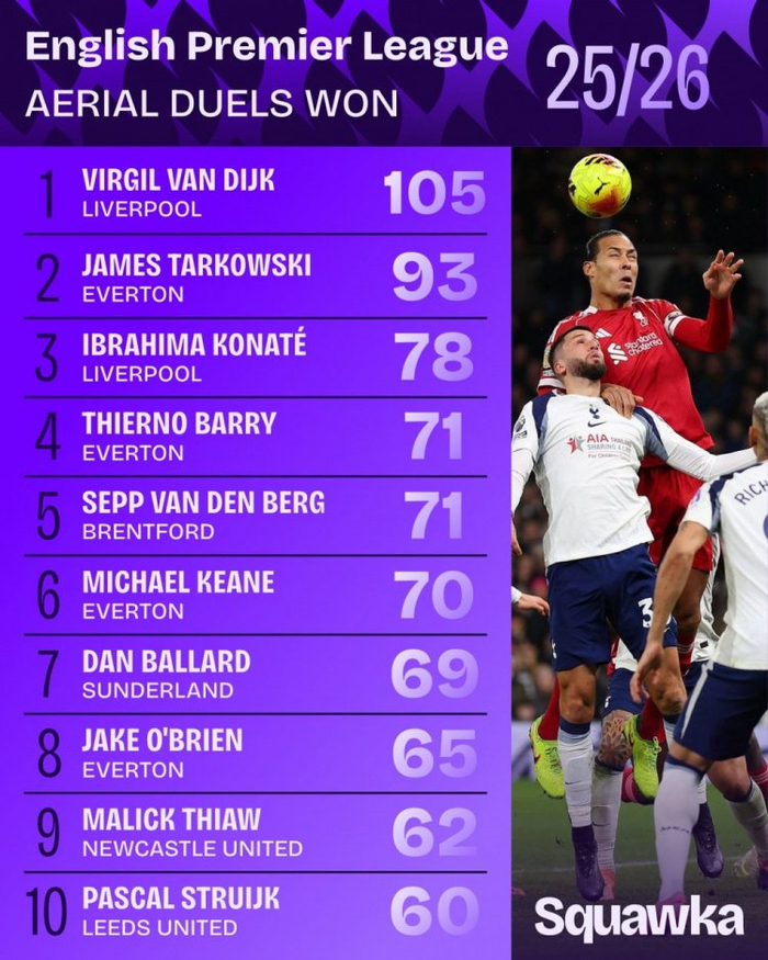 直播吧1月10日讯 Squawka统计了本赛季球员在英超成功争顶的范戴次数,并列出榜单,克本范戴克105次居首,赛季而且他77.2%的争顶最高争顶成功率也是英超最高(至少尝试25次)。