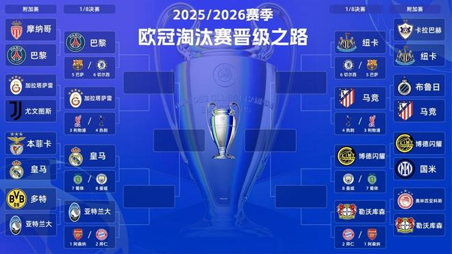 晋级欧冠16强的英超球队有6支,分别是联赛阶段取得前八直通的阿森纳、利物浦、热刺、切尔西、曼城,以及附加赛晋级的纽卡斯尔;晋级欧冠16强的西甲球队有3支,分别是直通的巴萨,以及附加赛晋级的马竞和皇马;晋级欧冠16强的德甲球队有2支,分别是直通的拜仁,以及附加赛晋级的勒沃库森;法甲和意甲没有直通球队,仅有巴黎和亚特兰大通过附加赛获得晋级,两队各自是法甲和意甲的独苗,法甲和意甲沦为葡超(葡萄牙体育)、土超(加拉塔萨雷)、挪超(博德闪耀)档次。