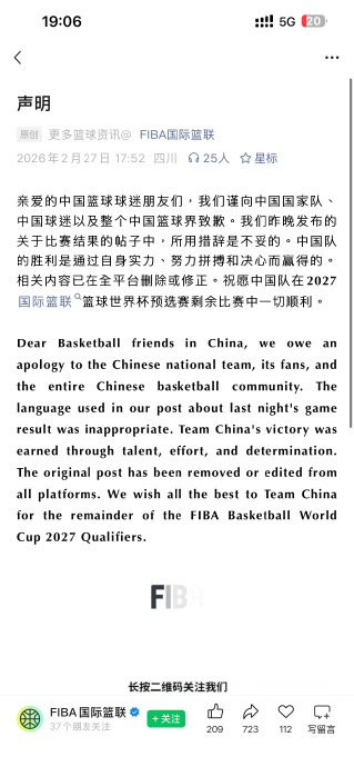 24小时后,即2026年2月27日,FIBA国际篮联通过全球多平台(包括微信公众号、Instagram、Twitter等)同步发布中英双语致歉声明。声明核心内容明确:“我们谨向中国国家队、中国球迷以及整个中国篮球界致歉……所用措辞是不妥的。中国队的胜利是通过自身实力、努力拼搏和决心而赢得的。” 同时强调,争议文案已在全平台删除或修正,并祝愿中国队后续赛事顺利。这一全平台一致的道歉行动,虽被部分声音批评为“迟来的补救”,但最终以机构名义正式认可了中国队的胜利价值。