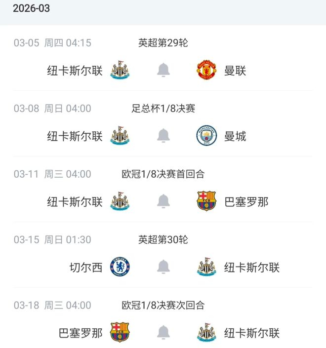 纽卡两眼一黑?3月迎地狱赛程!14天5战连踢曼联曼城+巴萨切尔西