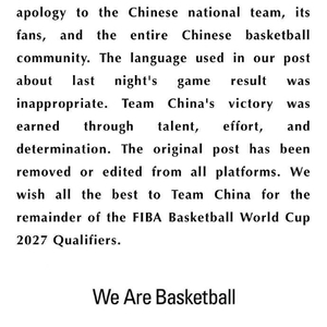 #国际篮联向中国男篮致歉# 昨晚中国男篮在世预赛客场逆转日本男篮,赛后FIBA使用“中国男篮从日本偷走一场胜利”(China with a sneaky win over Japan)的表述引发争议。今天FIBA国际篮联发布声明向中国男篮致歉。