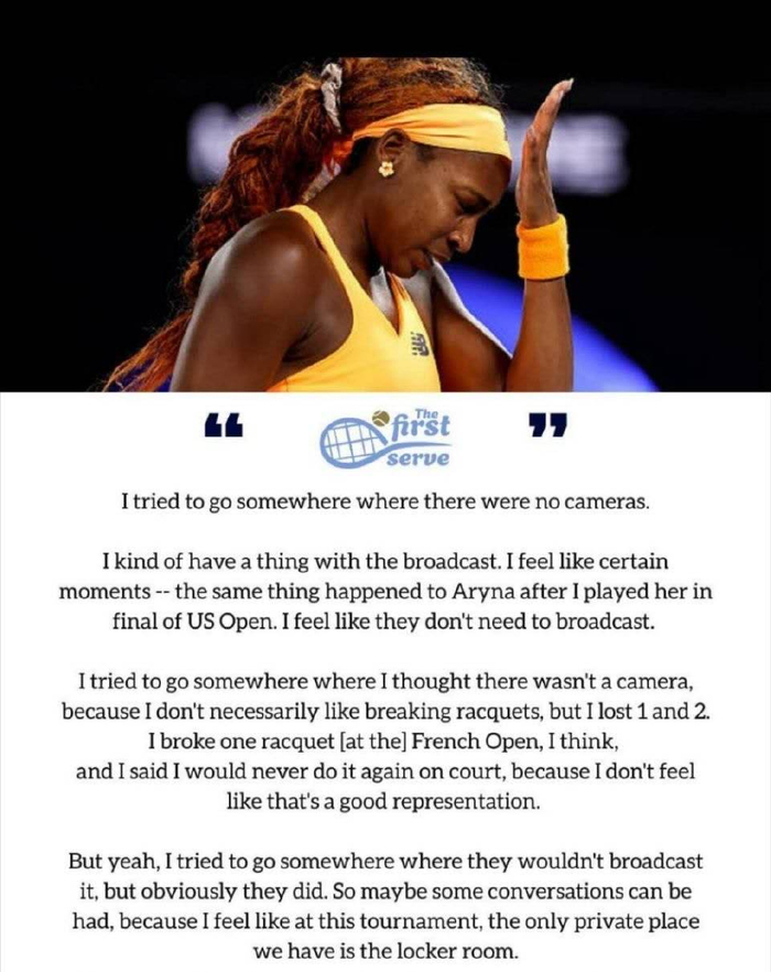 这一创举的直接导火索,来自上个月澳网发生的一幕。当时,美国名将高芙在女单八强被爆冷出局后,强忍怒火回到球员通道怒摔球拍,画面却被大会镜头捕捉并直播,引发了关于球员隐私的广泛争议 。包括斯瓦泰克、德约科维奇在内的多位网坛巨星都曾公开呼吁,希望外界尊重球员场外的生活空间,不被打扰 。