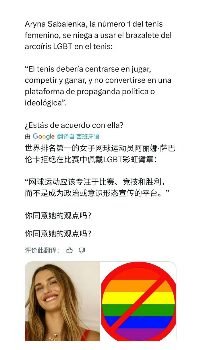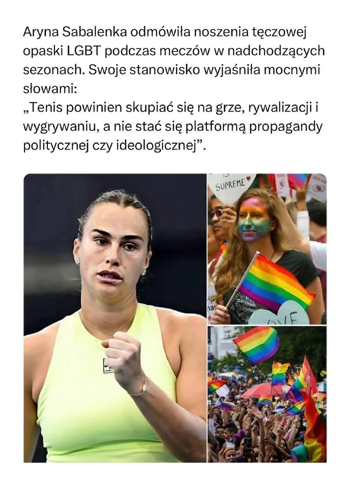 近日,一则帖子在外网疯狂传播。帖主声称,阿琳娜·萨巴伦卡已“拒绝在未来赛季的比赛中佩戴LGBT彩虹手环”,并配以强硬的言辞阐述其立场:“网球应该专注于比赛、竞争与胜利,而不是成为政治或意识形态宣传的平台。”