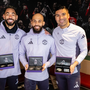 在分别达成英超特定进球、出场数里程碑后,曼联球员卡塞米罗、姆伯莫和马特乌斯-库尼亚获赠纪念奖章。