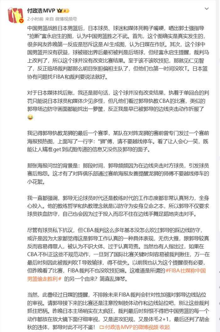 对于日本媒体找后账,我还是那句话,这个球并没有改变结果,执着于单回合的判罚只能说日本球员和媒体少见多怪,但凡他们看过郭导执教CBA的比赛,类似的郭导场边防守画面都能找出一箩筐,反正我是早已被郭导的边线夹击动作折服了。