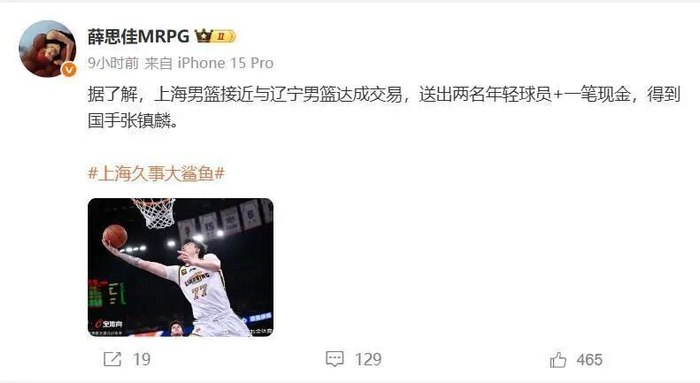 CBA大交易!张镇麟加盟上海队,辽宁队得到2名年轻球员和千万现金