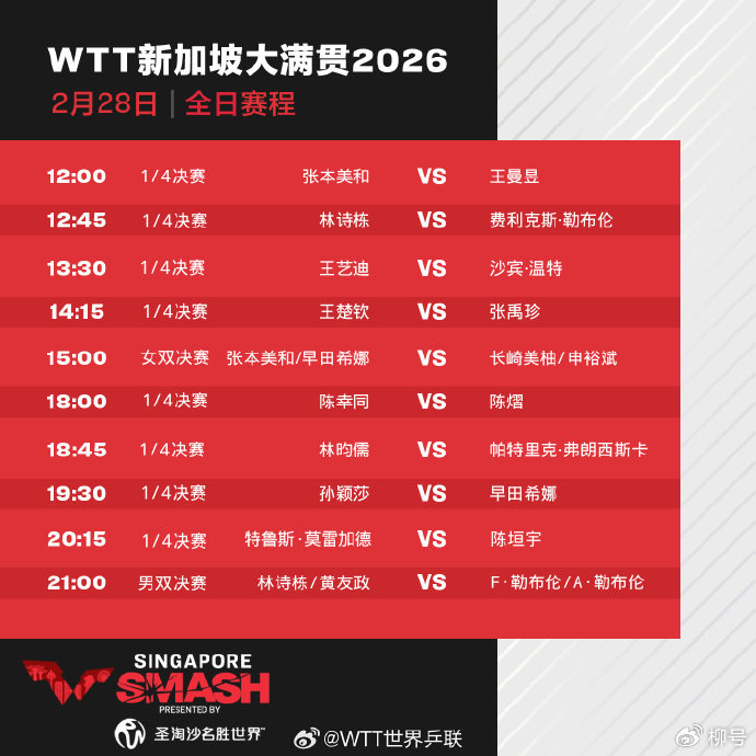北京时间2月28日消息,2026年WTT新加坡大满贯继续进行,CCTV5、CCTV5+直播比赛实况。男女单打1/4决赛,共有王楚钦、孙颖莎、王曼昱、林诗栋、陈幸同等8名中国选手出战。其中,王曼昱与日本选手张本美和(12:00)、孙颖莎与日本选手早田希娜的比赛最受关注(19:30)。