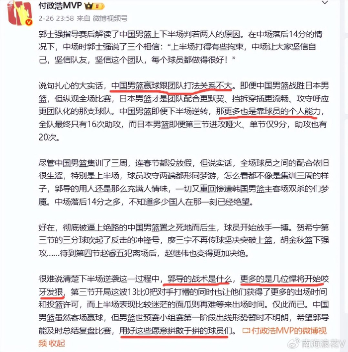 赛后,名记付政浩发表了多篇评论,有赞扬队员表现神勇的点评,有肯定贺希宁几个球员敢打敢拼的点评。但他也敢说真话,寻找胜利中的存在问题和不足。不得不说付政浩敢于说真话,他公开说中国男篮赢球跟团队打法关系不大,与郭士强战术无关,即便是下半场也看不到郭士强战术,全是依靠球员的个人能力实现了逆转,是依靠贺希宁和赵继伟的三分球打开了活路。