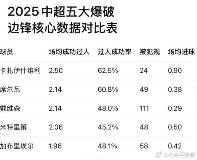 从这个数据表里我们可以看出,中超第一爆点球员是卡扎,他的场均成功过人次数是2.5次,成功率高达62%。也就是你知道卡扎要过你突进去,你就是挡不住。