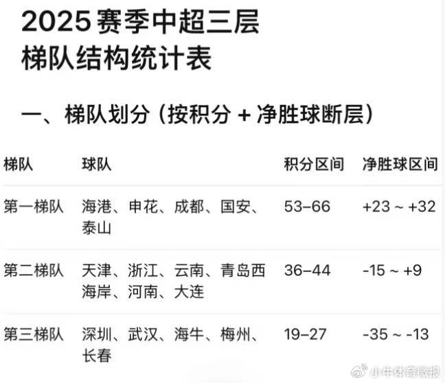 我们从25赛季中超排名分区来看,可以非常清晰地看到三个梯队结构。